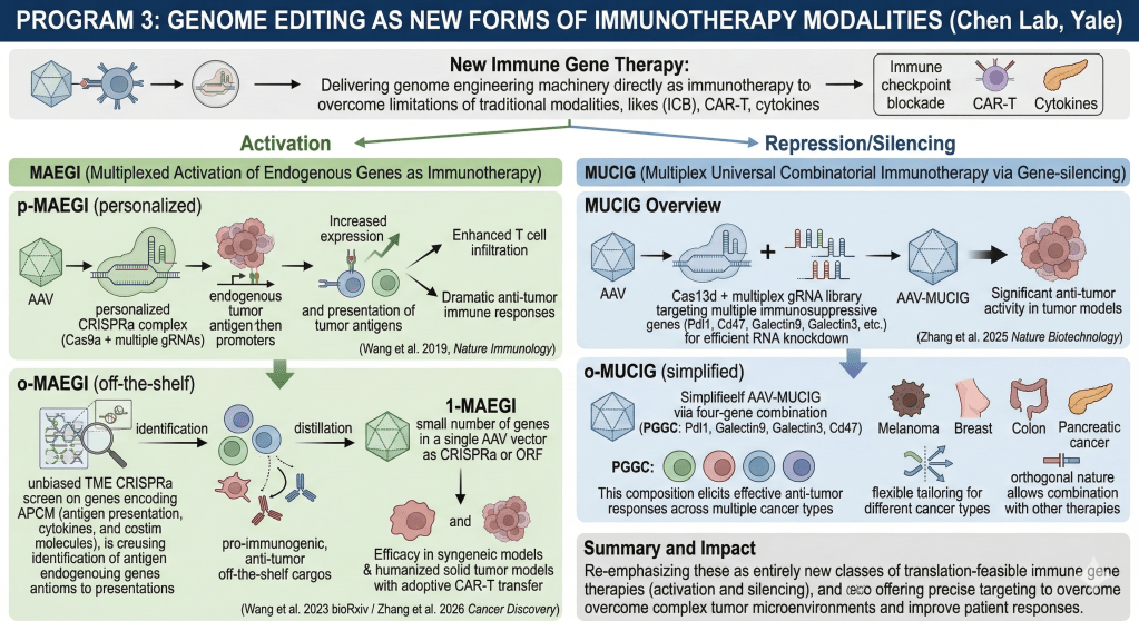 In order to create off-the-shelf therapeutics and to simplify the manufacturing process, we recently advanced these concepts and developed off-the-shelf versions of MAEGI (o-MAEGI) that are more straightforward for translation (Wang et al. 2023 bioRxiv / Zhang et al. 2026 Cancer Discovery). The selection of fixed composition cargos for gene therapy is often by literature rationale and often only single genes. However, the number of immune genes that can be delivered or activated as potential therapeutics is large, and the combinations can increase exponentially. By devising an unbiased TME CRISPRa screen on genes encoding antigen presentation, cytokines and costim molecules (APCM), we have identified the o-MAEGI cargos that are pro-immunogenic and anti-tumor (Wang et al. 2023). We have been performing extensive optimization of the composition and further distilled to a small number of genes that can fit in one single AAV vector (1-MAEGI) for delivery as CRISPRa or simple ORFs. Our o-MAEGI and 1-MAEGI candidates showed significant efficacy in syngeneic models, as well as humanized solid tumor model with adoptive CAR-T cell transfer. o-MAEGI thus provide promising and translation-feasible candidates for next-gen immune gene therapy.